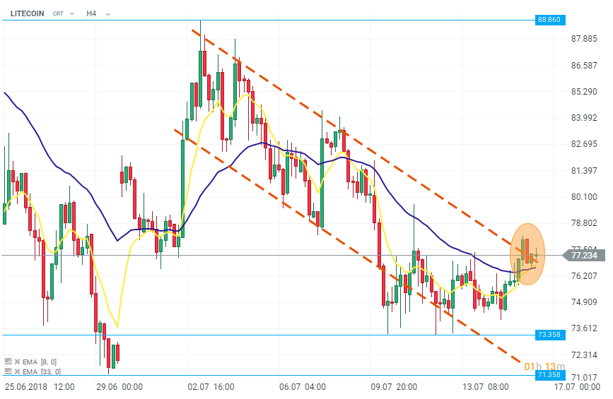 LITECOIN se apreciază. Moneda încearcă să spargă limita superioară a canalului descendent (zona portocalie). O creștere mai puternică ar putea contribui la spargerea acestui nivel, însă dacă tabăra bulls nu va fi capabilă să controleze piața, prețul ar putea reveni în intervalul canalului menționat anterior. Sursa: xStation5