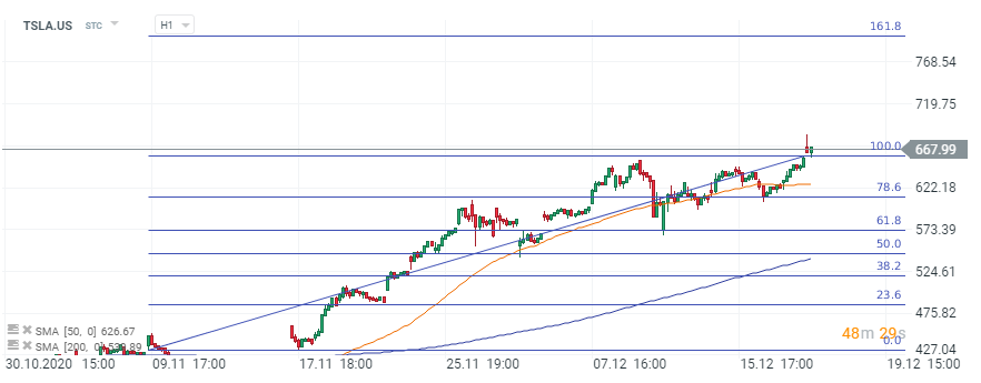 Pentru moment, investitorii tind să ignore toate aceste aspecte, lăsându-se duși de val. Euforia actuală din piețe a reușit să ducă prețul acțiunilor Tesla către atingerea de noi maxime istorice la 684 USD. Situația grafică tinde să confirme impulsul de creștere, pe grafic fiind vizibil un trend ascendent clar. Faptul că prețul acțiunilor evoluează deasupra mediei mobile de 50 de perioade ar putea să ofere mai multă încredere investitorilor pe termen scurt întrucât oferă ”o plasă de siguranță”. Având în vedere că ne aflăm în teritorii noi, este dificil de spus care este următorul nivel de rezistență pentru cumpărători. În acest sens, un posibil obiectiv țintă este la 800 USD, care este susținut de o retragere exterioară Fibonacci de 161,8%.