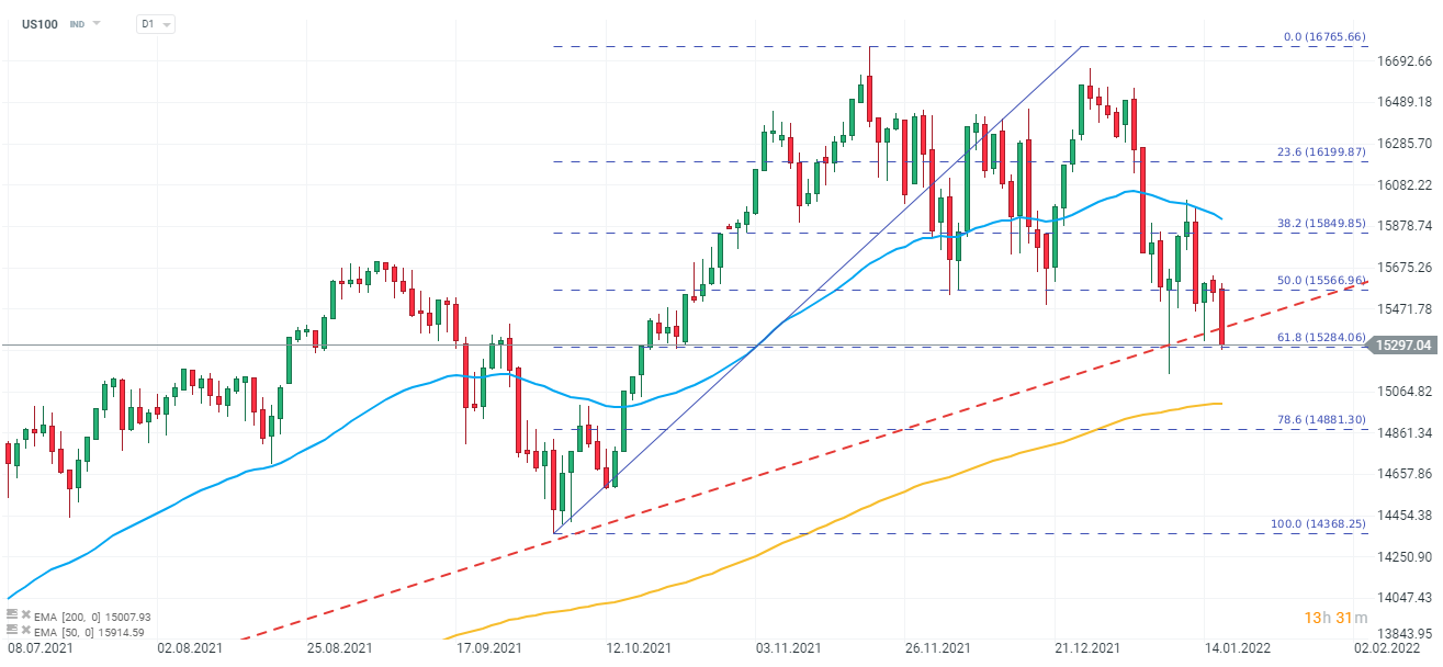 US100, interval D1. Contractele futures pe indicele tehnologic din SUA au scăzut brusc la începutul sesiunii de astăzi, picând din nou sub limita inferioară a liniei ascendente pe termen lung și întâmpinând dificultăți în a rămâne deasupra retragerii Fibonacci de 63,8%. Dacă scăderile accelerează, următorul nivel de suport poate fi aproape de 15.150 de puncte. Rezistența locală rămâne la 15.500 de puncte. Sursa: xStation 5