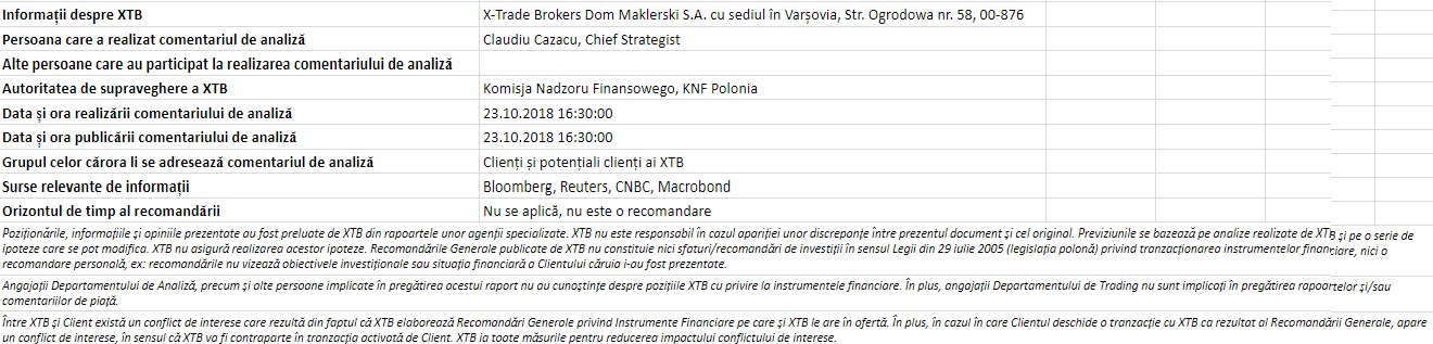 "Acest material este o comunicare de marketing în sensul articolului 24 alineatul (3) din Directiva 2014/65 / UE a Parlamentului European și a Consiliului din 15 mai 2014 privind piețele de instrumente financiare, și de modificare a Directivei 2002/92 / CE și a Directivei 2011 / 61 / UE (MiFID II). Comunicarea de marketing nu este o recomandare de investiții sau o recomandare de informații sau o recomandare care sugerează o strategie de investiții în sensul Regulamentului (UE) nr. 596/2014 al Parlamentului European și al Consiliului din 16 aprilie 2014 privind abuzul de piață ( reglementarea abuzului de piață) și de abrogare a Directivei 2003/6 / CE a Parlamentului European și a Consiliului și a Directivelor Comisiei 2003/124 / CE, 2003/125 / CE și 2004/72 / CE și a Regulamentului delegat (UE) 2016/958 al Comisiei din 9 596/2014 al Parlamentului European și al Consiliului în ceea ce privește standardele tehnice de reglementare pentru aranjamentele tehnice pentru prezentarea obiectivă a recomandărilor de investiții sau a altor informații care sugerează strategii de investiții și pentru dezvăluirea de interese particulare sau indicații de conflicte de interese sau orice alte sfaturi, inclusiv în domeniul consultanței în materie de investiții, în sensul Legii privind tranzacționarea cu instrumente financiare din 29 iulie 2005 (de ex. Journal of Laws 2019, articolul 875, astfel cum a fost modificat). Comunicarea de marketing este pregătită cu cea mai mare diligență, obiectivitate, prezintă faptele cunoscute autorului la data pregătirii și este lipsită de orice elemente de evaluare. Comunicarea de marketing este pregătită fără a lua în considerare nevoile clientului, situația sa financiară individuală și nu prezintă nicio strategie de investiții în niciun fel. Comunicarea de marketing nu constituie o ofertă de vânzare, oferire, abonament, invitație la cumpărare, reclamă sau promovare a oricărui instrument financiar. XTB SA nu este responsabilă pentru acțiunile sau omisiunile niciunui client, în special pentru achiziționarea sau cedarea instrumente, întreprinse pe baza informațiilor conținute în această comunicare de marketing. XTB SA nu va accepta răspunderea pentru nicio pierdere sau daună, inclusiv, fără limitare, orice pierdere care poate apărea direct sau indirect, efectuată pe baza informațiilor conținute în această comunicare de marketing. În cazul în care comunicarea de marketing conține informații despre orice rezultat cu privire la instrumentele financiare indicate în acestea, acestea nu constituie nicio garanție sau prognoză cu privire la rezultatele viitoare. Performanțele anterioare nu indică neapărat rezultatele viitoare și orice persoană care acționează pe baza acestor informații o face pe propriul risc. Acest material nu este emis pentru a influenta deciziile de tranzacționare ale niciunei persoane. Informațiile cuprinse în cadrul acestui material nu sunt prezentate pentru a fi aplicate, copiate sau testate în cadrul tranzacțiilor dumneavoastră. Informațiile cuprinse în cadrul acestui material sunt emise în baza experienței proprii a emitentului și nu reprezintă o recomandare individuală, nu vizează atingerea anumitor obiective, randamente financiare și nu se adresează nevoilor niciunei persoane anume care ar primi-o. Premisele acestui material nu au în vedere situația și persoana dumneavoastră deci nu recomandăm utilizarea acestor informații sub orice formă. Utilizarea informațiilor cuprinse în cadrul acestui material în orice modalitate se face pe propria dumneavoastră răspundere. Acest material este emis de către un analist pentru care își asumă răspunderea XTB SA, persoană juridică autorizată de KNF – Autoritatea de Supraveghere Financiara din Polonia."