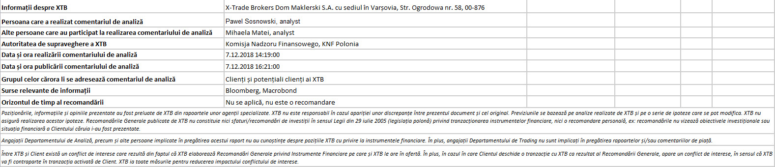 "Acest material este o comunicare de marketing în sensul articolului 24 alineatul (3) din Directiva 2014/65 / UE a Parlamentului European și a Consiliului din 15 mai 2014 privind piețele de instrumente financiare, și de modificare a Directivei 2002/92 / CE și a Directivei 2011 / 61 / UE (MiFID II). Comunicarea de marketing nu este o recomandare de investiții sau o recomandare de informații sau o recomandare care sugerează o strategie de investiții în sensul Regulamentului (UE) nr. 596/2014 al Parlamentului European și al Consiliului din 16 aprilie 2014 privind abuzul de piață ( reglementarea abuzului de piață) și de abrogare a Directivei 2003/6 / CE a Parlamentului European și a Consiliului și a Directivelor Comisiei 2003/124 / CE, 2003/125 / CE și 2004/72 / CE și a Regulamentului delegat (UE) 2016/958 al Comisiei din 9 596/2014 al Parlamentului European și al Consiliului în ceea ce privește standardele tehnice de reglementare pentru aranjamentele tehnice pentru prezentarea obiectivă a recomandărilor de investiții sau a altor informații care sugerează strategii de investiții și pentru dezvăluirea de interese particulare sau indicații de conflicte de interese sau orice alte sfaturi, inclusiv în domeniul consultanței în materie de investiții, în sensul Legii privind tranzacționarea cu instrumente financiare din 29 iulie 2005 (de ex. Journal of Laws 2019, articolul 875, astfel cum a fost modificat). Comunicarea de marketing este pregătită cu cea mai mare diligență, obiectivitate, prezintă faptele cunoscute autorului la data pregătirii și este lipsită de orice elemente de evaluare. Comunicarea de marketing este pregătită fără a lua în considerare nevoile clientului, situația sa financiară individuală și nu prezintă nicio strategie de investiții în niciun fel. Comunicarea de marketing nu constituie o ofertă de vânzare, oferire, abonament, invitație la cumpărare, reclamă sau promovare a oricărui instrument financiar. XTB SA nu este responsabilă pentru acțiunile sau omisiunile niciunui client, în special pentru achiziționarea sau cedarea instrumente, întreprinse pe baza informațiilor conținute în această comunicare de marketing. XTB SA nu va accepta răspunderea pentru nicio pierdere sau daună, inclusiv, fără limitare, orice pierdere care poate apărea direct sau indirect, efectuată pe baza informațiilor conținute în această comunicare de marketing. În cazul în care comunicarea de marketing conține informații despre orice rezultat cu privire la instrumentele financiare indicate în acestea, acestea nu constituie nicio garanție sau prognoză cu privire la rezultatele viitoare. Performanțele anterioare nu indică neapărat rezultatele viitoare și orice persoană care acționează pe baza acestor informații o face pe propriul risc. Acest material nu este emis pentru a influenta deciziile de tranzacționare ale niciunei persoane. Informațiile cuprinse în cadrul acestui material nu sunt prezentate pentru a fi aplicate, copiate sau testate în cadrul tranzacțiilor dumneavoastră. Informațiile cuprinse în cadrul acestui material sunt emise în baza experienței proprii a emitentului și nu reprezintă o recomandare individuală, nu vizează atingerea anumitor obiective, randamente financiare și nu se adresează nevoilor niciunei persoane anume care ar primi-o. Premisele acestui material nu au în vedere situația și persoana dumneavoastră deci nu recomandăm utilizarea acestor informații sub orice formă. Utilizarea informațiilor cuprinse în cadrul acestui material în orice modalitate se face pe propria dumneavoastră răspundere. Acest material este emis de către un analist pentru care își asumă răspunderea XTB SA, persoană juridică autorizată de KNF – Autoritatea de Supraveghere Financiara din Polonia."
