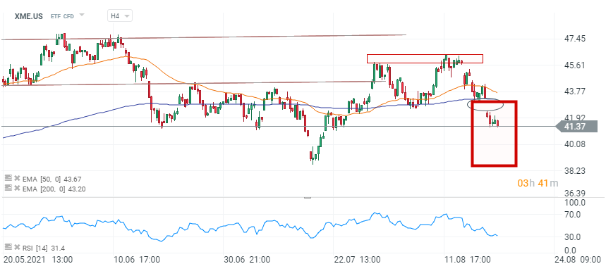 Din punct de vedere tehnic, graficul H4 al ETF-ului SPDR S&P Metals & Mining ne sugerează o potențială extindere a corecției. Secvența descendentă a debutat pe 13 august iar la o distanță de doar o săptămână discutăm despre o depreciere de aproximativ 11%. Pe grafic s-a conturat o formațiune Double Top, cu vârfurile în zona 46,40 USD. Deschiderea sesiunii de ieri a adus un gap descendent care a dus la spargerea neckline-ului modelului, ceea ce, în teorie, presupune o scădere către pragul 38,70 USD (limita inferioară a dreptunghiului). Pentru moment, se observă o tendință de ezitare care ar putea fi justificată de faptul că indicatorul RSI a ajuns în zona de 30 de puncte, fapt care, în trecutul apropiat, a vestit redresări ale prețului, dar confirmarea modelului ar trebui să fie respectată.