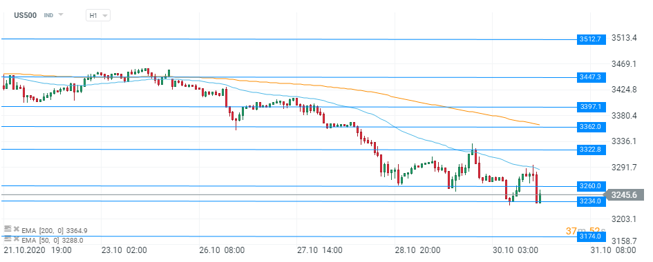 Analizând graficul US500, observăm un semnal optimist pentru cumpărători și anume faptul că suportul de la 3.234 de puncte se dovedește unul destul de solid. Acesta a marcat deja o a doua victorie astăzi în fața vânzătorilor iar, în trecut, a reprezentat un obstacol destul de solid. Pe termen scurt, prețul ar putea încerca să recupereze o parte din pierderi pe final de sesiune, motiv pentru care depășirea zonei de la 3.260 de puncte ar putea să ofere mai multă încredere cumpărătorilor. Totuși, trebuie să reținem că potențialul de a avansa este limitat de media mobilă de 50 de perioade (linia albastră), care în momentul de față se află la 3.290 de puncte. Aceasta a întrerupt încercările recente ale cumpărătorilor de a avansa.