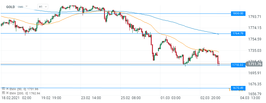 Analizând graficul H1 al aurului putem observa potențialul de apariție a unei formațiuni bullish: un Double Top în zona 1.710 USD. Prețul testează această barieră chiar în acest moment iar în cazul în care ar avea loc un ricoșeu, cumpărătorii ar putea primi semnalul așteptat. În teorie, mișcarea ascendentă s-ar putea îndrepta către nivelul 1.764 USD care marchează punctul de început al secvenței de scădere recentă. Totuși, în calea entuziasmului cumpărătorilor s-ar putea afla și media mobilă de 50 de perioade care a fost foarte importantă în ultima perioadă.