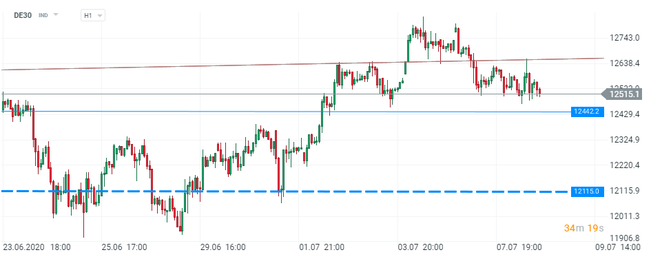 În acest context mixt, se observă o tendință de consolidare a indicilor europeni, în special la nivelul DE30. Astfel, după corecția suferită ieri dimineață, cotația s-a stabilizat în jurul nivelului de la 12550 de puncte. Principalul nivel de rezistență este marcat de limita inferioară a canalului ascendent pe termen mediu care se află la aproximativ 12655 de puncte, în timp ce o zonă cheie de susținere pentru cumpărători poate fi găsită la 12442 de puncte, nivel care este marcat de numeroase reacții de preț în trecut. Nivelul ridicat de incertitudine ar putea favoriza această evoluție, cel puțin până când va apărea un factor important, fie el pozitiv sau negativ, care să ofere o direcție clară evoluției prețului. În acest sens, spargerea oricărei dintre cele două niveluri menționate anterior ar putea reprezenta un factor determinant.