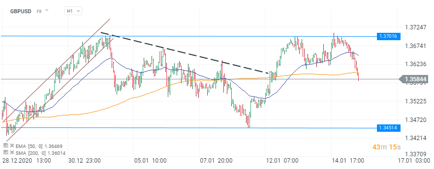Perechea GBPUSD a avut de suferit și pe fondul unor date dezamăgitoare din Marea Britanie. Economia insulară s-a contractat cu 2,6% în noiembrie, marcând prima scădere lunară a producției din aprilie, când a avut loc primul lockdown național. În acest moment, economia este cu 8,5% mai mică decât înainte de începutul pandemiei din februarie. Lira sterlină a încercat inițial să avanseze la începutul sesiunii, dar a suferit o inversare, arătând semne de slăbiciune pe măsură ce se îndrepta către nivelul de suport de la 1,36. Aceasta este o zonă care a fost importantă de mai multe ori. Analizând situația grafică observăm apariția unei situații interesante: o formațiune Double Top. După o a doua testare nereușită a nivelului de rezistență locală de la 1,37, cotația a suferit acea scădere amplă. O confirmare pare să vină având în vedere că prețul a spart în jos și cele două medii mobile de 50 și 200 de perioade (liniile portocalii și albastre). Astfel, drumul pare a fi deschis către 1,34514 care reprezintă punctul de plecare al secvenței ascendente inițiale.