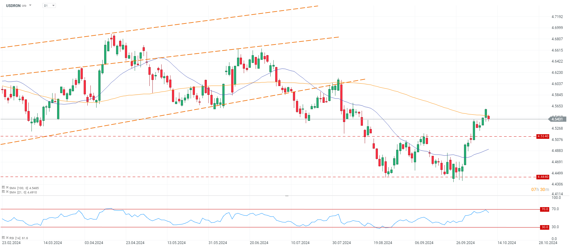 În acest context, perechea USDRON a continuat mișcarea ascendentă în afara canalului lateral. Mai mult, cumpărătorii au reușit să testeze media mobilă de 100 de perioade (dreapta galbenă), însă s-a retras astăzi la sfârșit de săptămână cu 0,34%. Această mișcare a urmat îndeaproape dinamica indicelui dolarului american, prin urmare evenimentele de săptămâna viitoare, vânzările de retail, pot alimenta volatilitatea perechii.