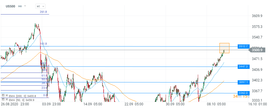 Analizând graficul, observăm că US500 a reușit să își extindă secvență ascendentă începută săptămâna trecută, construind pe fondul unui context cu un apetit ridicat pentru risc, pe măsură ce investitorii au devenit mai optimiști. În continuare, drumul pare deschis către testarea nivelului de rezistență de la 3512 puncte, care este marcat de o retragere exterioară Fibonacci de 161,8% din impulsul ascendent din luna august. În plus, acest nivel a reprezentat și una dintre barierele finale care au deschis drumul către atingerea de noi maxime istorice la începutul lui septembrie. În eventualitatea în care vom asista la o reducere a încrederii, cumpărătorii ar putea găsi susținere în zona 3447 puncte, care este marcată de mai multe reacții de preț în trecut.