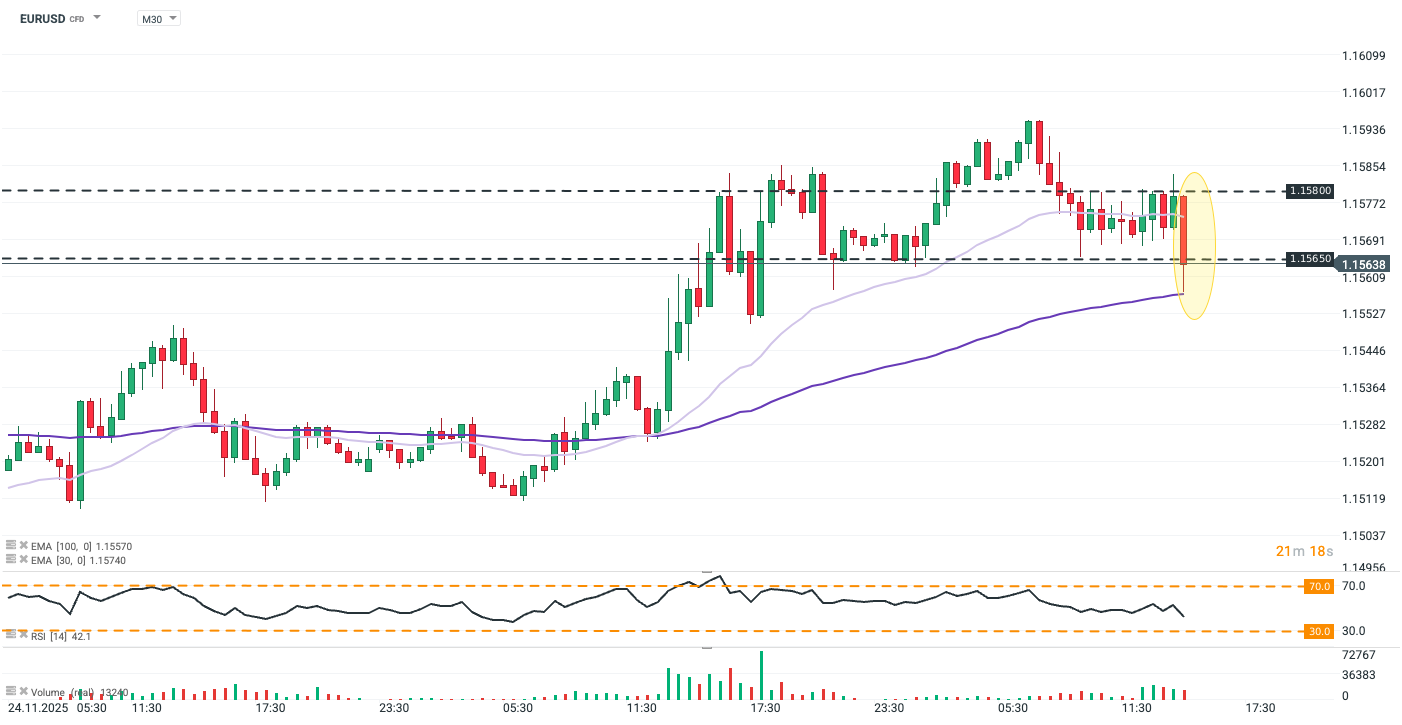 Scăderea neașteptată a cererilor de șomaj din SUA la cel mai scăzut nivel din ultimele 7 luni a făcut ca EURUSD să revină sub nivelul cheie de 1,158. Perechea este în prezent în scădere cu 0,1%, în ciuda câștigurilor de 0,2% înregistrate la începutul tranzacționării, deși vânzările s-au oprit la EMA pe 100 de perioade pe intervalul M30. Cele mai recente date privind cererile de șomaj nu aduc argumente noi pentru reducerea ratei dobânzii în decembrie, deși piețele rămân destul de încrezătoare în următoarea mișcare dovish a Fed (instrumentul FedWatch al CME estimează o probabilitate de 85% pentru o reducere de 25 de puncte de bază).
