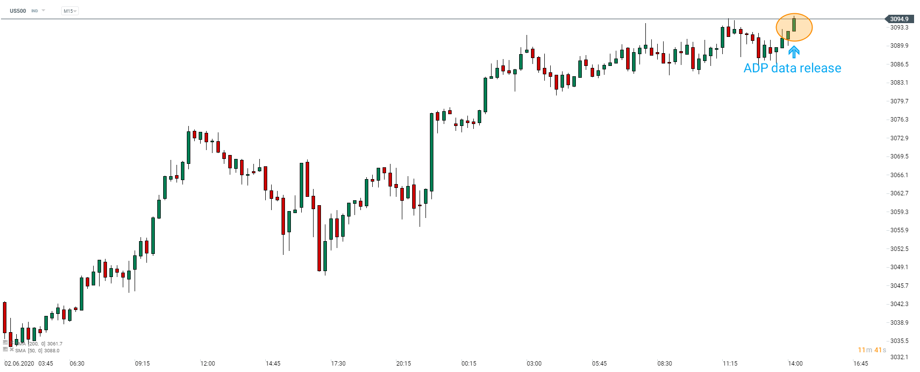 Raportul ADP privind schimbarea locurilor de muncă din SUA în luna mai a fost publicat la 3:15 am ora României. Datele erau prognozate să indice o scădere de 9 milioane de locuri de muncă după o scădere de 20,2 milioane în luna aprilie. Cu toate acestea, raportul a arătat o scădere de doar 2,76 milioane de locuri de muncă. Deși aceasta este o valoare foarte mare în termeni absoluți, este mult mai bună decât indicau prognozele. Cu toate acestea, acțiunile și dolarul american nu au reacționat în urma publicării raportului.