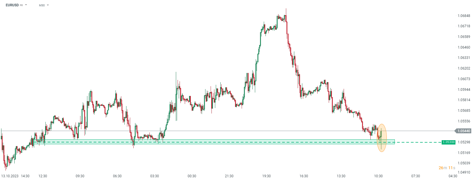 EURUSD a scăzut în urma publicării raportului PIB trimestrial al SUA. Cu toate acestea, perechea nu a reușit să spargă sub zona de suport pe termen scurt din zona 1,0530 și s-a întors ulterior în sus. Sursa: xStation 5