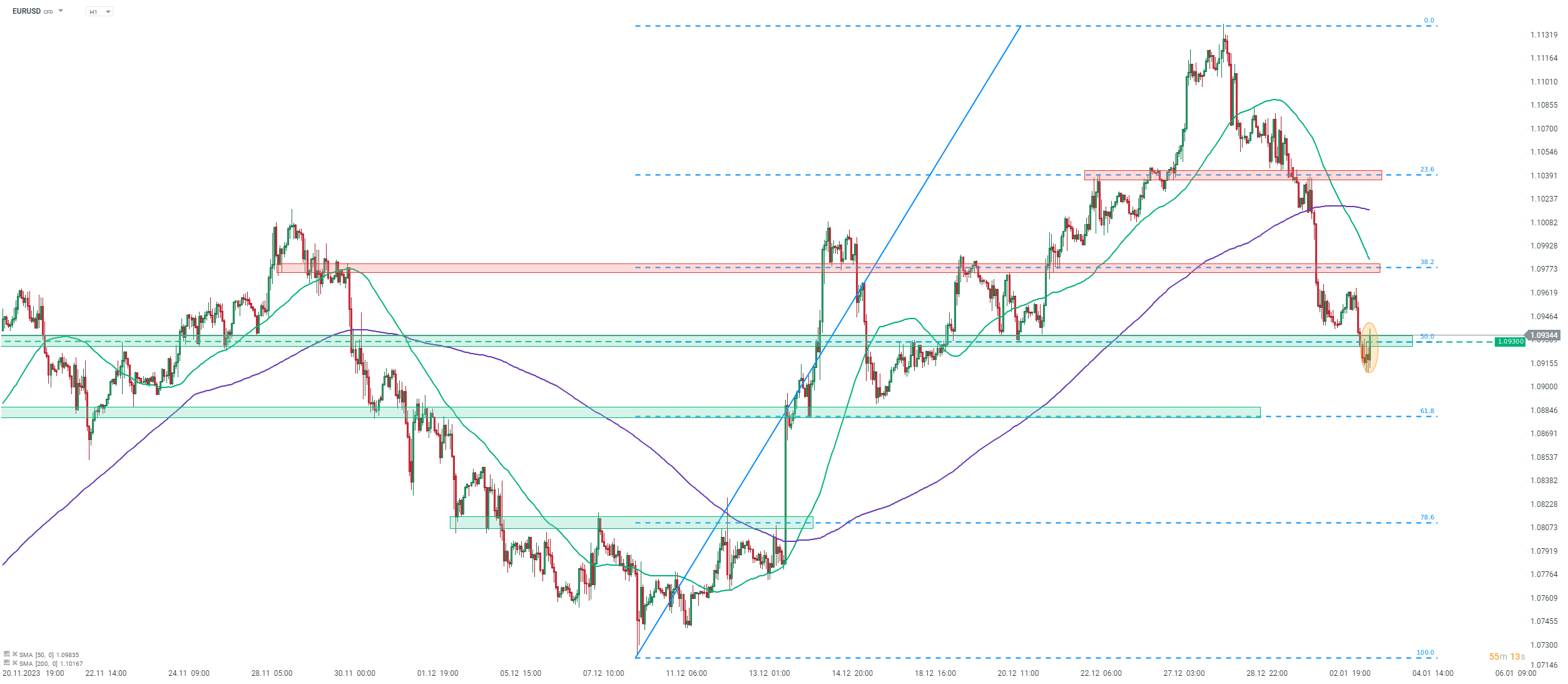 Dolarul american a slăbit în urma publicațiilor, iar EURUSD a încercat să revină peste zona de preț de 1,0930, marcată cu o retragere Fibonacci de 50% din mișcarea ascendentă lansată la începutul lunii decembrie 2023. Sursa: xStation 5