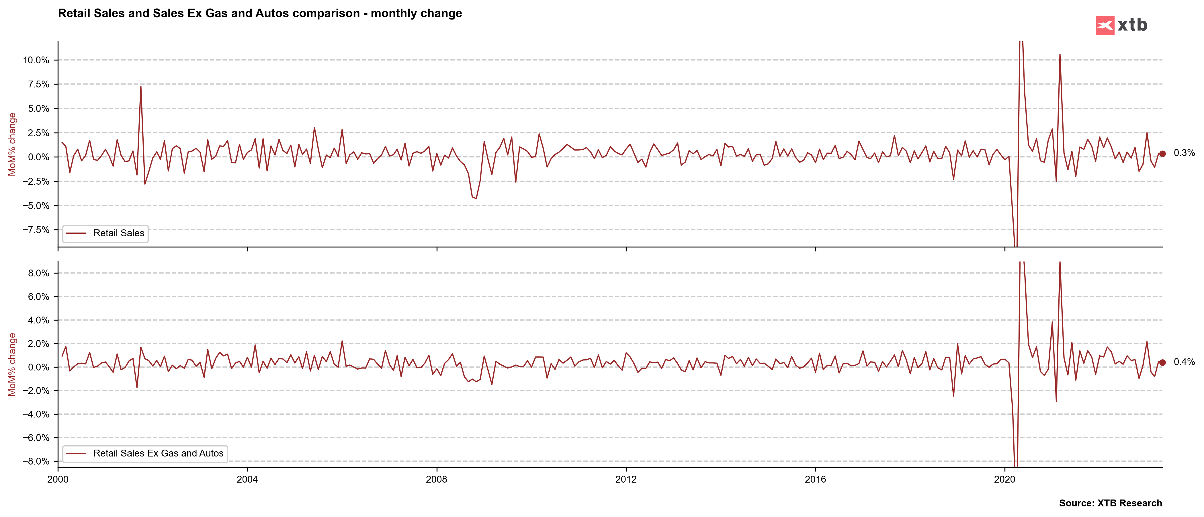 Datele reale s-au dovedit a fi mai bune decât se aștepta piața. Vânzările headline au depășit așteptările, vânzările core (ex-auto) au fost în ton cu prognozele, în timp ce vânzările core (ex-auto & gaz) au depășit, de asemenea, așteptările. Raportul evidențiază puterea consumatorului american, care este un argument pentru ca Fed să continue cu majorări ale ratelor dobânzilor pentru a reduce inflația.