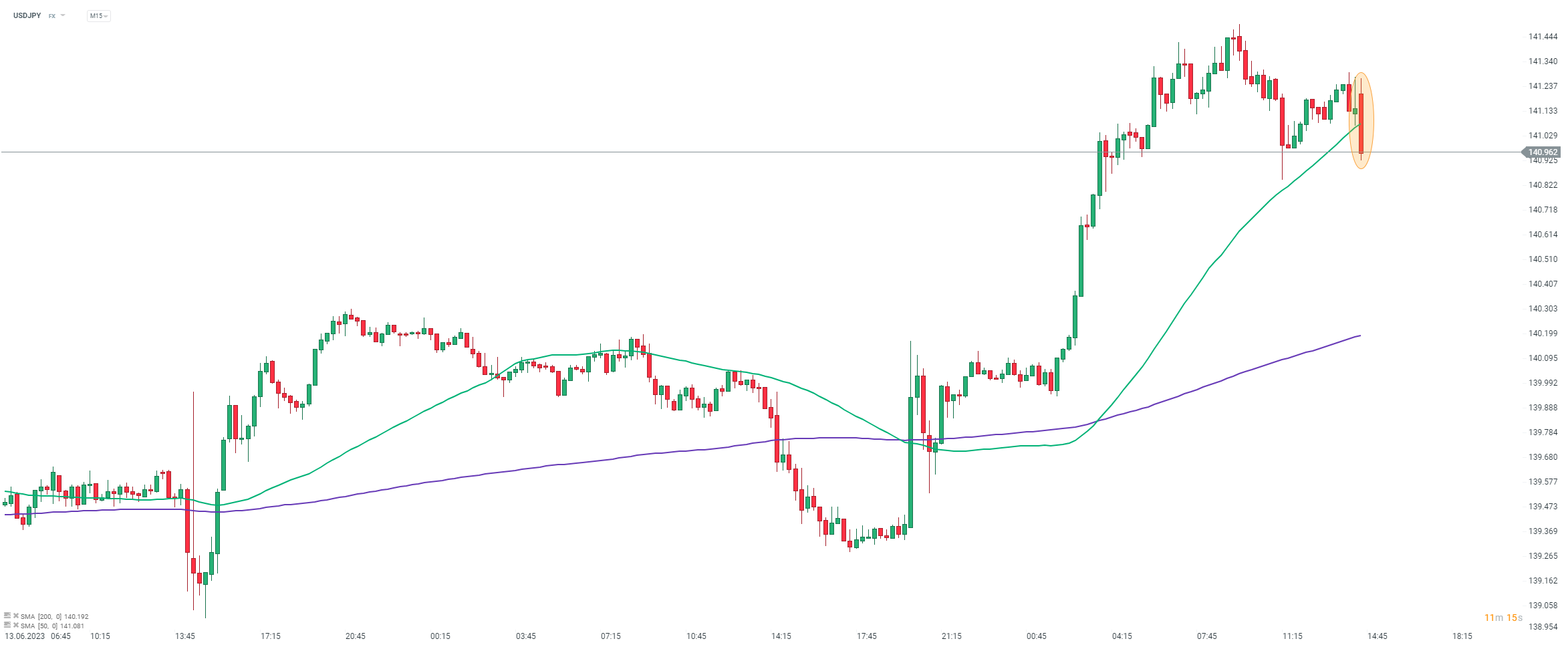USDJPY a scăzut după publicarea datelor privind vânzările de retail din SUA și a scăzut sub media mobilă pe 50 de perioade la interval de 15 minute (linia verde). Sursa: xStation5