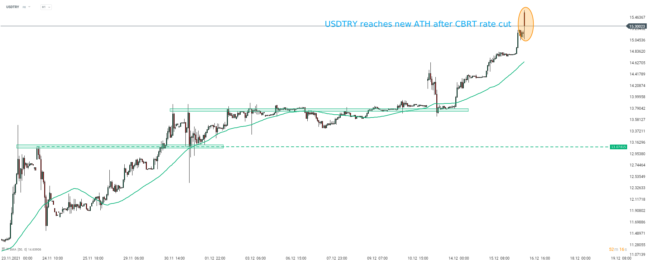USDTRY a crescut după anunțul deciziei. Cu toate acestea, cea mai mare parte a mișcării a fost ștearsă rapid în urma unui raport conform căruia CBRT a folosit deja spațiul pentru reducerile de dobândă.
