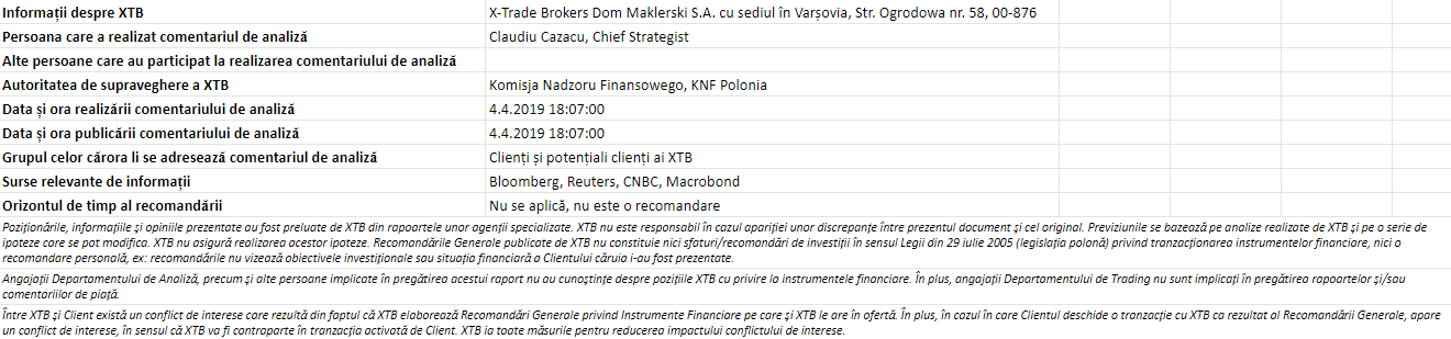 "Acest material este o comunicare de marketing în sensul articolului 24 alineatul (3) din Directiva 2014/65 / UE a Parlamentului European și a Consiliului din 15 mai 2014 privind piețele de instrumente financiare, și de modificare a Directivei 2002/92 / CE și a Directivei 2011 / 61 / UE (MiFID II). Comunicarea de marketing nu este o recomandare de investiții sau o recomandare de informații sau o recomandare care sugerează o strategie de investiții în sensul Regulamentului (UE) nr. 596/2014 al Parlamentului European și al Consiliului din 16 aprilie 2014 privind abuzul de piață ( reglementarea abuzului de piață) și de abrogare a Directivei 2003/6 / CE a Parlamentului European și a Consiliului și a Directivelor Comisiei 2003/124 / CE, 2003/125 / CE și 2004/72 / CE și a Regulamentului delegat (UE) 2016/958 al Comisiei din 9 596/2014 al Parlamentului European și al Consiliului în ceea ce privește standardele tehnice de reglementare pentru aranjamentele tehnice pentru prezentarea obiectivă a recomandărilor de investiții sau a altor informații care sugerează strategii de investiții și pentru dezvăluirea de interese particulare sau indicații de conflicte de interese sau orice alte sfaturi, inclusiv în domeniul consultanței în materie de investiții, în sensul Legii privind tranzacționarea cu instrumente financiare din 29 iulie 2005 (de ex. Journal of Laws 2019, articolul 875, astfel cum a fost modificat). Comunicarea de marketing este pregătită cu cea mai mare diligență, obiectivitate, prezintă faptele cunoscute autorului la data pregătirii și este lipsită de orice elemente de evaluare. Comunicarea de marketing este pregătită fără a lua în considerare nevoile clientului, situația sa financiară individuală și nu prezintă nicio strategie de investiții în niciun fel. Comunicarea de marketing nu constituie o ofertă de vânzare, oferire, abonament, invitație la cumpărare, reclamă sau promovare a oricărui instrument financiar. XTB SA nu este responsabilă pentru acțiunile sau omisiunile niciunui client, în special pentru achiziționarea sau cedarea instrumente, întreprinse pe baza informațiilor conținute în această comunicare de marketing. XTB SA nu va accepta răspunderea pentru nicio pierdere sau daună, inclusiv, fără limitare, orice pierdere care poate apărea direct sau indirect, efectuată pe baza informațiilor conținute în această comunicare de marketing. În cazul în care comunicarea de marketing conține informații despre orice rezultat cu privire la instrumentele financiare indicate în acestea, acestea nu constituie nicio garanție sau prognoză cu privire la rezultatele viitoare. Performanțele anterioare nu indică neapărat rezultatele viitoare și orice persoană care acționează pe baza acestor informații o face pe propriul risc. Acest material nu este emis pentru a influenta deciziile de tranzacționare ale niciunei persoane. Informațiile cuprinse în cadrul acestui material nu sunt prezentate pentru a fi aplicate, copiate sau testate în cadrul tranzacțiilor dumneavoastră. Informațiile cuprinse în cadrul acestui material sunt emise în baza experienței proprii a emitentului și nu reprezintă o recomandare individuală, nu vizează atingerea anumitor obiective, randamente financiare și nu se adresează nevoilor niciunei persoane anume care ar primi-o. Premisele acestui material nu au în vedere situația și persoana dumneavoastră deci nu recomandăm utilizarea acestor informații sub orice formă. Utilizarea informațiilor cuprinse în cadrul acestui material în orice modalitate se face pe propria dumneavoastră răspundere. Acest material este emis de către un analist pentru care își asumă răspunderea XTB SA, persoană juridică autorizată de KNF – Autoritatea de Supraveghere Financiara din Polonia."