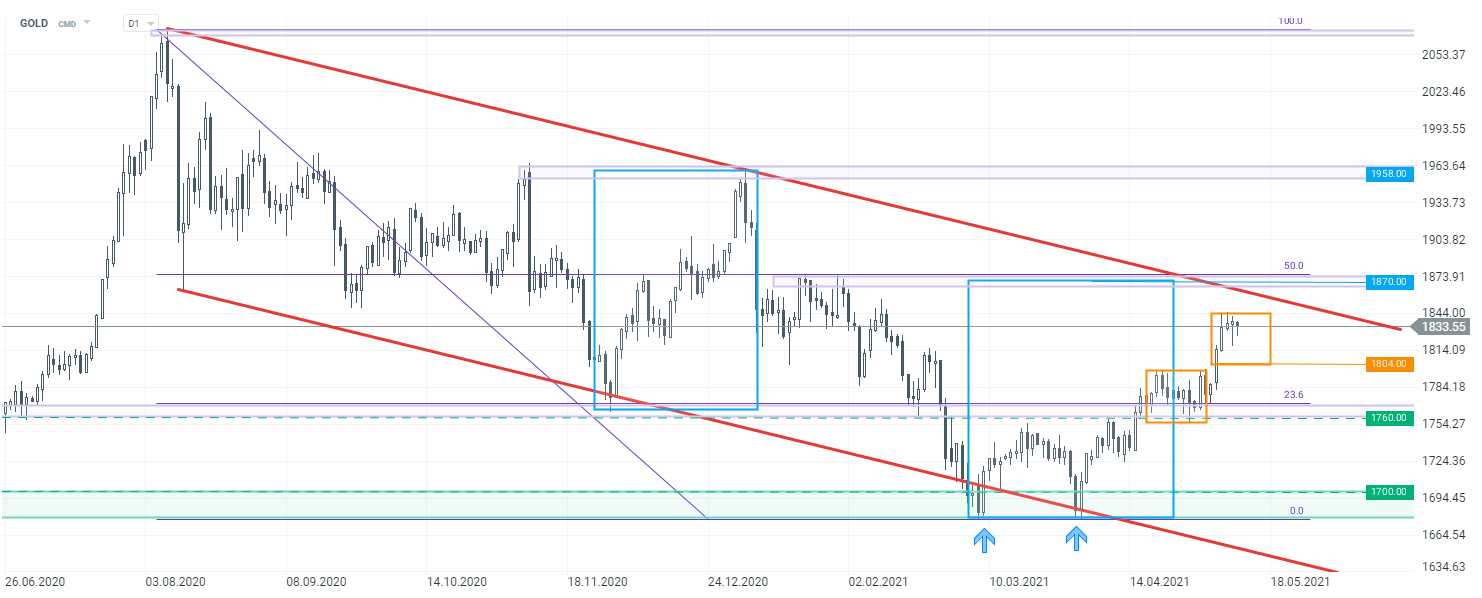 Să începem analiza de astăzi cu piața aurului. Urmărind intervalul zilnic, se poate observa că metalul prețios a inițiat o corecție ascendentă. Mișcarea recentă în sus este susținută de formațiunea de prețuri amplă Double Bottom. În cazul în care va prevala sentimentul actual, cumpărătorii ar trebui să urmărească zona de rezistență de la 1.870 USD, care este marcată cu limita superioară a structurii 1: 1 (dreptunghiuri albastre) și retragerea Fibonacci de 50% a mișcării descendente începute în august 2020. Pe de altă parte, dacă vânzătorii reușesc să oprească mișcarea ascendentă, cel mai apropiat suport de urmărit se află la 1.804 USD și este determinat de structura locală 1: 1 (dreptunghiurile portocalii).