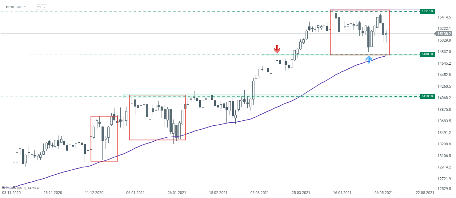 Nu în ultimul rând, să aruncăm o privire asupra indicelui german DAX (DE30). Analizând intervalul H4, putem vedea că mișcarea ascendentă recentă s-a oprit la jumătatea lunii aprilie și a fost lansată o corecție descendentă. Cu toate acestea, mișcarea descendentă pare mai degrabă o continuare a unei mișcări laterale decât o vânzare mai amplă. Conform metodologiei Overbalance, atâta timp cât prețul se situează deasupra suportului de la 14.800 de puncte, tendința principală rămâne ascendentă. În cazul în care vânzătorii reușesc să împingă prețul sub suportul menționat anterior, poate începe o corecție descendentă mai consistentă. Într-un astfel de scenariu, următorul suport de urmărit se află în proximitatea nivelului de 14.100 de puncte.