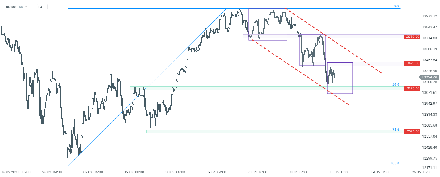 Privind situația tehnică a indicelui tehnologic american - Nasdaq (US100), se poate observa că indicele se tranzacționează într-un canal descendent local. US100 a atins nivelul maxim din aprilie, dar cumpărătorii nu au reușit să mențină impulsul și a început o corecție descendentă. Cea mai apropiată rezistență de urmărit se află la 13.420 puncte și este marcată cu limita superioară a structurii 1: 1 și reacțiile anterioare ale prețului. În cazul în care vânzătorii reușesc să își mențină avantajul, este posibil ca prețul să se apropie de minimele de ieri.