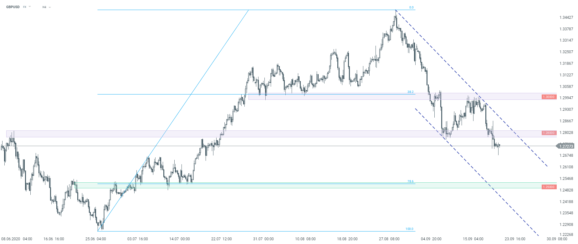 În această săptămână putem observa o continuare a declinurilor. Privind intervalul H4, prețul a scăzut ieri sub un suport important, cel de la 1,2800, astfel încât vânzarea poate continua. În prezent, atâta timp cât perechea se tranzacționează în cadrul canalului descendent, scenariul de bază este atacul asupra suportului de la 1,2500, care este determinat de retragerea Fibonacci de 78,6% din ultimul val de creștere, împreună cu reacțiile anterioare de preț. Cu toate acestea, în cazul în care cumpărătorii reușesc să depășească nivelul menționat anterior (1,2800), atunci corecția ar putea atinge nivelul 1,30, care este marcată de secvența descendentă și retragerea Fibonacci de 38,2%.