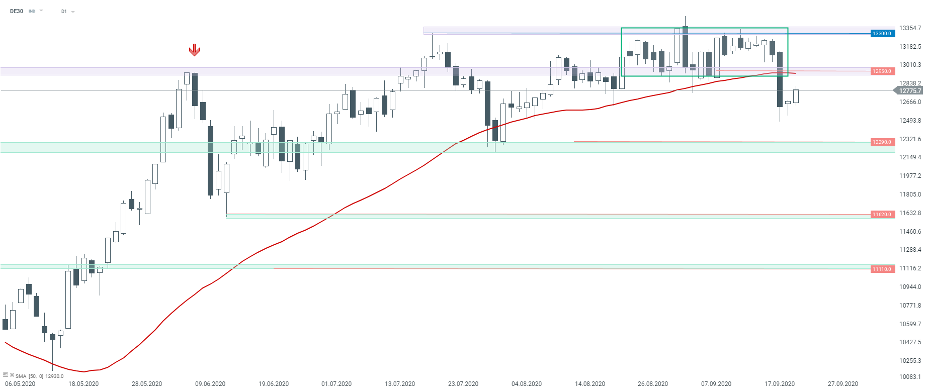 Indicele german a evoluat recent într-o secvență clară de consolidare, cu toate acestea la începutul săptămânii prețul a scăzut sub limita inferioară a intervalului lateral. După ce a scăzut sub suportul de la 12.950 puncte, vânzarea a accelerat, dar în ultimele două zile prețul a revenit. Cu toate acestea, situația tehnică nu s-a schimbat. Atâta timp cât indicele se situează sub nivelul menționat anterior, cel de 12.950 puncte (care a fost, de asemenea, consolidat de media mobilă de 50 de perioade), scăderile suplimentare rămân scenariul de bază. În prezent, cel mai apropiat suport important este situat în jurul valorii de 12.290 puncte și este marcat de reacția anterioară a prețului. Pe de altă parte, scenariul de scădere va fi anulat atunci când prețul revine deasupra barierei de la 12.290 puncte. În acest caz, indicele s-ar putea deplasa rapid către rezistență de la 13.300 puncte.