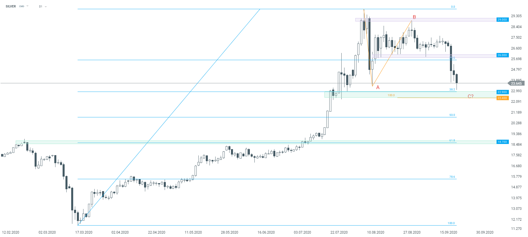În ultimele zile, am putut observa scăderi importante pe piața argintului. După ce vânzătorii au dus prețul sub nivelul de 26 USD, vânzarea s-a intensificat și în prezent prețul argintului se tranzacționează cu 10% sub prețul de închidere din ultima săptămână. Din punct de vedere tehnic, prețul se apropie de o zonă cheie de suport situată între 22.90 și 22.40. Zona marcată cu verde este determinată de retragerea Fibonacci de 38,2% a ultimei mișcări de creștere, reacțiile anterioare ale prețului și de geometria corecției potențiale liniare ABC. În cazul în care cumpărătorii reușesc să oprească declinurile aici, atunci există șanse pentru un alt impuls ascendent. În caz contrar, o spargere descendentă ar putea duce la scăderi mai ample, care ar putea atinge chiar și nivelul de suport de la 18,7 USD.