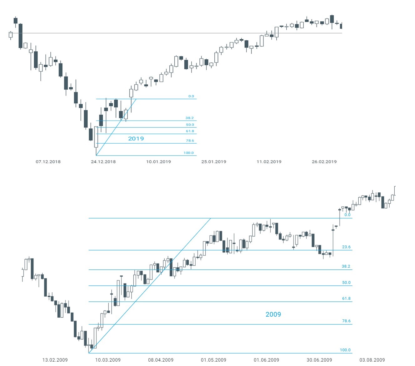 Situația arată complet diferit dacă aruncăm o privire la cele mai recente două căderi. Criza globală a provocat o scădere în 2008, iar la sfârșitul anului 2018 a avut loc o altă scădere de scurtă durată. Cu toate acestea, în ambele cazuri piața s-a depreciat cu peste 20%. Ceea ce este interesant de remarcat este faptul că aceste două căderi recente au fost urmate de reveniri complet diferite față de revenirile care au urmat căderilor masive din mileniul trecut. Odată ce nivelul minim a fost atins, piața a urcat. Cu toate acestea, după salt scurt, piața a suferit o corecție de aproximativ 38,2% din salt înainte de a se dezvolta un nou val mai amplu de creștere.