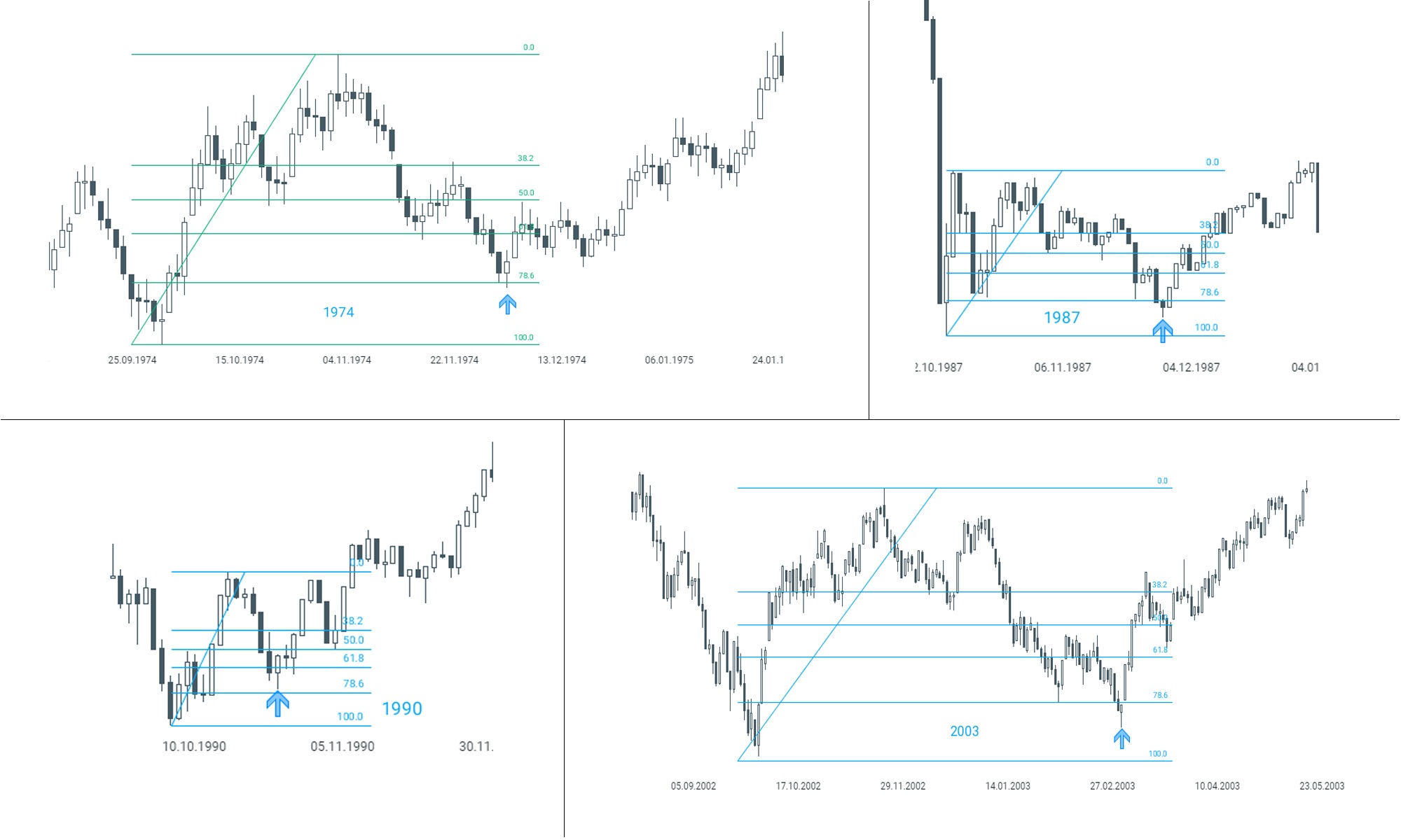 Vom analiza cu atenție graficul S&P 500 pe intervalul zilnic la începutul analizei noastre. În graficele de mai jos, am prezentat fazele finale ale piețelor de scădere anterioare. Căderile din anii 70, 80, 90 și începutul anilor 2000 arătau asemănător, dar în același timp sunt complet diferite decât cele pe care le observăm acum. În primul rând, declinurile inițiale au durat mult mai mult decât declinul din 2020 și în fiecare dintre cazurile anterioare a existat un fel de formațiune Double Bottom incompletă. Aceasta înseamnă că prima revenire după atingerea nivelului minim al pieței a fost urmată de o mișcare descendentă egală cu 70-80% din corecție. După ce o astfel de formațiune incompletă "double bottom" a fost trasată de preț, indicele a inițiat o mișcare ascendentă.