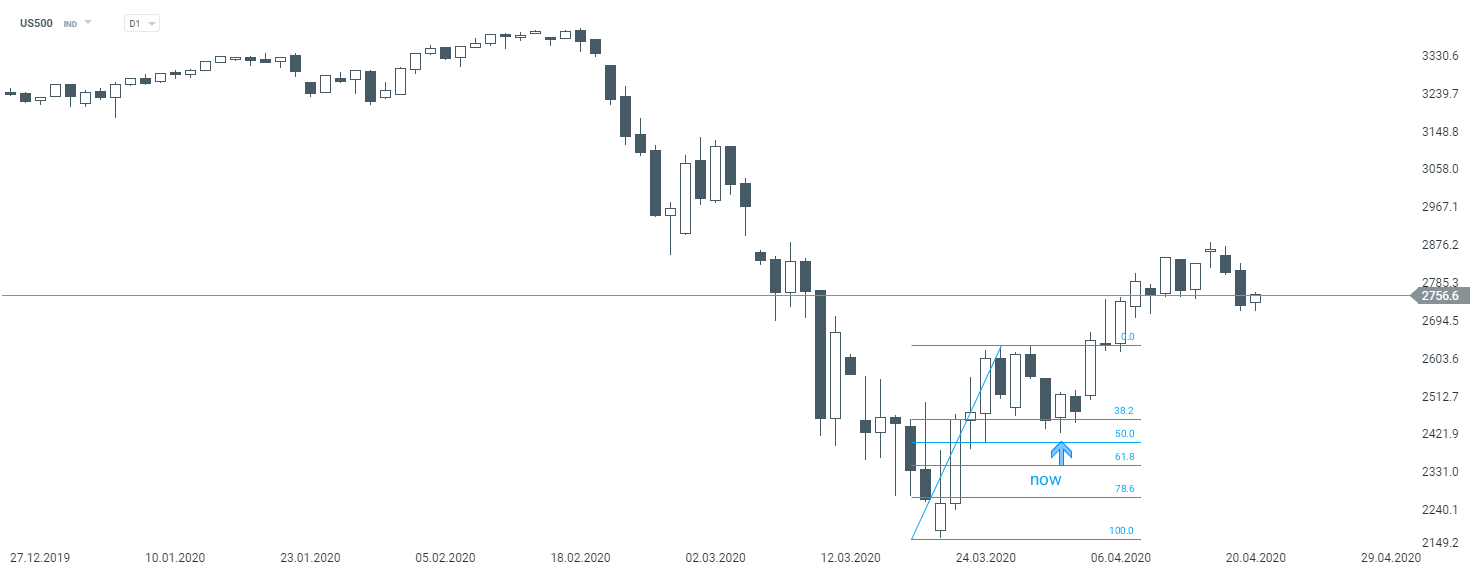 Privind graficul US500 din punct de vedere tehnic, se poate observa că indicele evoluează pe un trend descendent. Mișcarea de creștere recentă a fost oprită într-o zonă cheie de rezistență (2900 puncte) la sfârșitul săptămânii trecute și a fost urmată de o scădere. Zona menționată anterior este marcată de egalitatea valurilor A și C conform Teoriei valurilor Elliott. În plus, zona este marcată de reacțiile anterioare de preț și retragerea Fibonacci de 61,8% din mișcarea descendentă recentă. Cât timp prețul se află sub acest nivel, continuarea mișcării descendente pare a fi scenariul de bază. Spargerea ascendentă ar invalida configurația cu potențial descendent și ar putea împinge prețul mai sus, către nivelul de retragere Fibonacci de 78,6%.