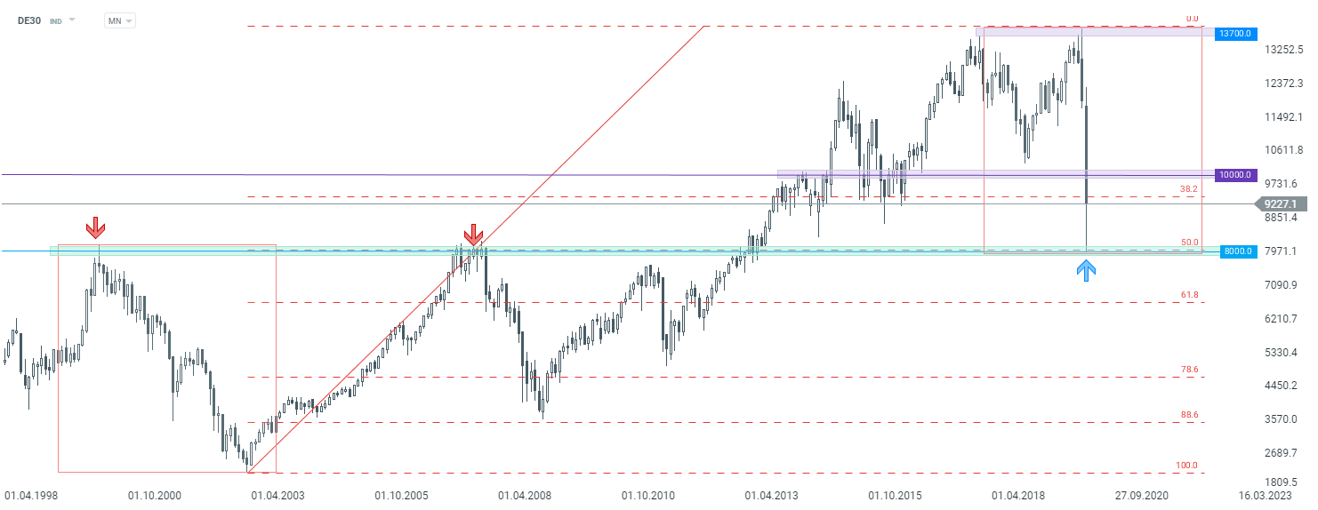 Tendința extinsă de se poate observa și la nivelul altor piețe bursiere, inclusiv DAX (DE30). Indicele german a început săptămâna cu un gap în scădere. Cu toate acestea, vânzătorii nu au reușit să extindă mișcarea descendentă și să ducă prețul sub minimele recente de la suportul de 8000 de puncte. Acest scenariu a marcat începutul unei corecții ascendente. Privind graficul din punct de vedere tehnic, se poate observa că nivelul cheie de suport este cel menționat anterior, la 8000 de puncte. În cazul în care corecția continuă, cumpărătorii pot ținti spre rezistența cheie (10000 puncte). Cu toate acestea, investitorii trebuie să țină cont de faptul că pandemia coronavirus este încă departe de a fi depășită și că acțiunile sunt predispuse unui presiuni descendente.