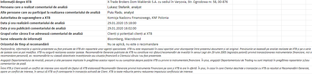 "Acest material este o comunicare de marketing în sensul articolului 24 alineatul (3) din Directiva 2014/65 / UE a Parlamentului European și a Consiliului din 15 mai 2014 privind piețele de instrumente financiare, și de modificare a Directivei 2002/92 / CE și a Directivei 2011 / 61 / UE (MiFID II). Comunicarea de marketing nu este o recomandare de investiții sau o recomandare de informații sau o recomandare care sugerează o strategie de investiții în sensul Regulamentului (UE) nr. 596/2014 al Parlamentului European și al Consiliului din 16 aprilie 2014 privind abuzul de piață ( reglementarea abuzului de piață) și de abrogare a Directivei 2003/6 / CE a Parlamentului European și a Consiliului și a Directivelor Comisiei 2003/124 / CE, 2003/125 / CE și 2004/72 / CE și a Regulamentului delegat (UE) 2016/958 al Comisiei din 9 596/2014 al Parlamentului European și al Consiliului în ceea ce privește standardele tehnice de reglementare pentru aranjamentele tehnice pentru prezentarea obiectivă a recomandărilor de investiții sau a altor informații care sugerează strategii de investiții și pentru dezvăluirea de interese particulare sau indicații de conflicte de interese sau orice alte sfaturi, inclusiv în domeniul consultanței în materie de investiții, în sensul Legii privind tranzacționarea cu instrumente financiare din 29 iulie 2005 (de ex. Journal of Laws 2019, articolul 875, astfel cum a fost modificat). Comunicarea de marketing este pregătită cu cea mai mare diligență, obiectivitate, prezintă faptele cunoscute autorului la data pregătirii și este lipsită de orice elemente de evaluare. Comunicarea de marketing este pregătită fără a lua în considerare nevoile clientului, situația sa financiară individuală și nu prezintă nicio strategie de investiții în niciun fel. Comunicarea de marketing nu constituie o ofertă de vânzare, oferire, abonament, invitație la cumpărare, reclamă sau promovare a oricărui instrument financiar. XTB SA nu este responsabilă pentru acțiunile sau omisiunile niciunui client, în special pentru achiziționarea sau cedarea instrumente, întreprinse pe baza informațiilor conținute în această comunicare de marketing. XTB SA nu va accepta răspunderea pentru nicio pierdere sau daună, inclusiv, fără limitare, orice pierdere care poate apărea direct sau indirect, efectuată pe baza informațiilor conținute în această comunicare de marketing. În cazul în care comunicarea de marketing conține informații despre orice rezultat cu privire la instrumentele financiare indicate în acestea, acestea nu constituie nicio garanție sau prognoză cu privire la rezultatele viitoare. Performanțele anterioare nu indică neapărat rezultatele viitoare și orice persoană care acționează pe baza acestor informații o face pe propriul risc. Acest material nu este emis pentru a influenta deciziile de tranzacționare ale niciunei persoane. Informațiile cuprinse în cadrul acestui material nu sunt prezentate pentru a fi aplicate, copiate sau testate în cadrul tranzacțiilor dumneavoastră. Informațiile cuprinse în cadrul acestui material sunt emise în baza experienței proprii a emitentului și nu reprezintă o recomandare individuală, nu vizează atingerea anumitor obiective, randamente financiare și nu se adresează nevoilor niciunei persoane anume care ar primi-o. Premisele acestui material nu au în vedere situația și persoana dumneavoastră deci nu recomandăm utilizarea acestor informații sub orice formă. Utilizarea informațiilor cuprinse în cadrul acestui material în orice modalitate se face pe propria dumneavoastră răspundere. Acest material este emis de către un analist pentru care își asumă răspunderea XTB SA, persoană juridică autorizată de KNF – Autoritatea de Supraveghere Financiara din Polonia."