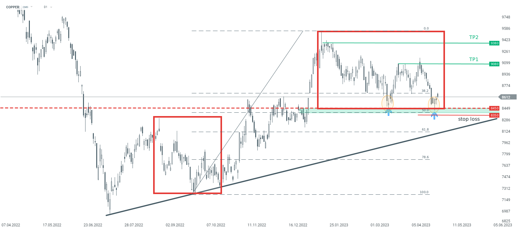 Opinie: Cuprul s-a tranzacționat recent într-o tendință ascendentă. Privind intervalul D1, se poate observa că prețul a ricoșat din nou pe zona de suport cheie aproape de 8.450. Zona marcată cu verde este rezultatul limitei inferioare a structurii 1:1 precum și al retragerii Fibonacci de 50% a mișcării recente în sus. În plus, pe grafic a apărut o formațiune locală Double Bottom. Luând în considerare acest lucru, ne-am putea aștepta la o creștere a prețului față de nivelurile actuale. Sursa: xStation5