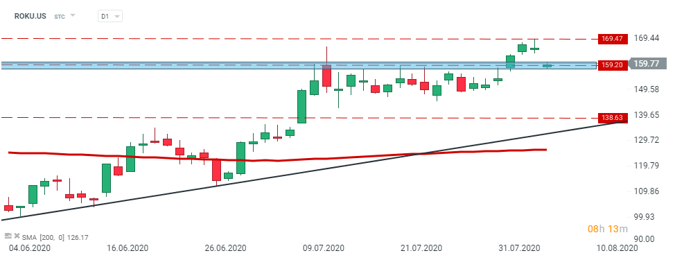 Roku (ROKU.US) - a deschis sesiunea de astăzi cu un gap negativ și testează nivelul de suport local de la 159,20 USD. În cazul în care pesimismul domină, poate intra în joc suportul de la 138.63 USD. Cu toate acestea, în cazul în care taurii vor prelua controlul, rezistența de la 169,47 USD pe acțiune ar putea fi în pericol. Sursa: xStation5