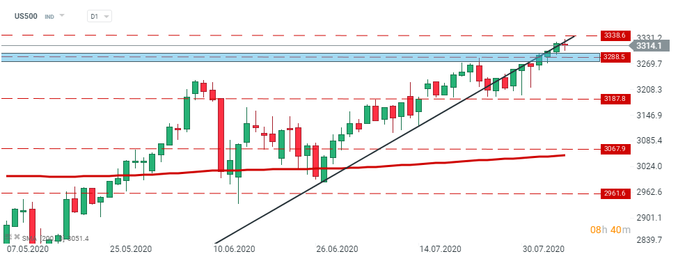 S&P 500 (US500) testează linia de trend ascendent depășită anterior. O revenire deasupra ei poate deschide calea unui impuls ascendent mai mare spre rezistența de la 3338,6 puncte. Pe de altă parte, în cazul în care indicele va sparge sub suportul de la 3284 de puncte, vânzătorii pot viza următorul suport, cel de la 3187,8 de puncte. Sursa: xStation5