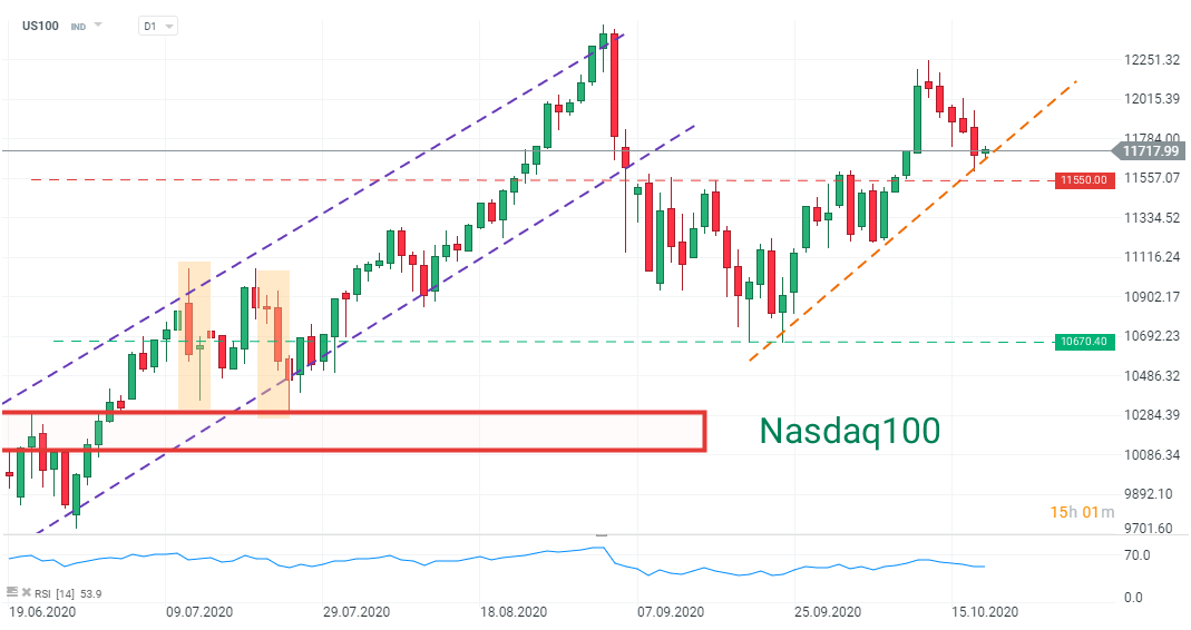 Piețele globale au început sesiunea de luni într-o manieră optimistă, dar acest sentiment pozitiv s-a evaporat rapid pe măsură ce cazurile în creștere au oprit din nou cumpărătorii. În plus, iPhone12 a primit opinii mixte și asta a afectat prețul acțiunilor Apple (AAPL.US) și, prin urmare, indicele US100.