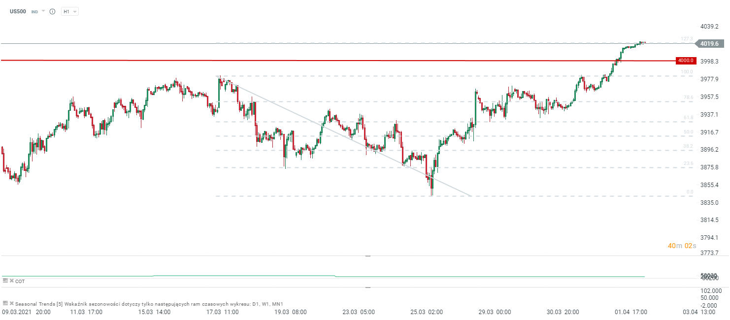 US500 a atins un obiectiv pe termen scurt în zona de 4.020 puncte, marcat cu o retragere exterioară Fibonacci de 127,2% a unei corecții descendente lansate la jumătatea lunii martie. Cu toate acestea, volatilitatea este limitată astăzi și reacția față de datele NFP poate fi timidă. Cu toate acestea, dacă datele arată o abatere majoră de la așteptări, mișcarea ar putea fi exagerată pe fondul unui nivel scăzut de lichiditate. Sursa: xStation5