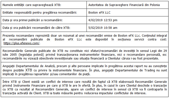 "Acest material este o comunicare de marketing în sensul articolului 24 alineatul (3) din Directiva 2014/65 / UE a Parlamentului European și a Consiliului din 15 mai 2014 privind piețele de instrumente financiare, și de modificare a Directivei 2002/92 / CE și a Directivei 2011 / 61 / UE (MiFID II). Comunicarea de marketing nu este o recomandare de investiții sau o recomandare de informații sau o recomandare care sugerează o strategie de investiții în sensul Regulamentului (UE) nr. 596/2014 al Parlamentului European și al Consiliului din 16 aprilie 2014 privind abuzul de piață ( reglementarea abuzului de piață) și de abrogare a Directivei 2003/6 / CE a Parlamentului European și a Consiliului și a Directivelor Comisiei 2003/124 / CE, 2003/125 / CE și 2004/72 / CE și a Regulamentului delegat (UE) 2016/958 al Comisiei din 9 596/2014 al Parlamentului European și al Consiliului în ceea ce privește standardele tehnice de reglementare pentru aranjamentele tehnice pentru prezentarea obiectivă a recomandărilor de investiții sau a altor informații care sugerează strategii de investiții și pentru dezvăluirea de interese particulare sau indicații de conflicte de interese sau orice alte sfaturi, inclusiv în domeniul consultanței în materie de investiții, în sensul Legii privind tranzacționarea cu instrumente financiare din 29 iulie 2005 (de ex. Journal of Laws 2019, articolul 875, astfel cum a fost modificat). Comunicarea de marketing este pregătită cu cea mai mare diligență, obiectivitate, prezintă faptele cunoscute autorului la data pregătirii și este lipsită de orice elemente de evaluare. Comunicarea de marketing este pregătită fără a lua în considerare nevoile clientului, situația sa financiară individuală și nu prezintă nicio strategie de investiții în niciun fel. Comunicarea de marketing nu constituie o ofertă de vânzare, oferire, abonament, invitație la cumpărare, reclamă sau promovare a oricărui instrument financiar. XTB SA nu este responsabilă pentru acțiunile sau omisiunile niciunui client, în special pentru achiziționarea sau cedarea instrumente, întreprinse pe baza informațiilor conținute în această comunicare de marketing. XTB SA nu va accepta răspunderea pentru nicio pierdere sau daună, inclusiv, fără limitare, orice pierdere care poate apărea direct sau indirect, efectuată pe baza informațiilor conținute în această comunicare de marketing. În cazul în care comunicarea de marketing conține informații despre orice rezultat cu privire la instrumentele financiare indicate în acestea, acestea nu constituie nicio garanție sau prognoză cu privire la rezultatele viitoare. Performanțele anterioare nu indică neapărat rezultatele viitoare și orice persoană care acționează pe baza acestor informații o face pe propriul risc. Acest material nu este emis pentru a influenta deciziile de tranzacționare ale niciunei persoane. Informațiile cuprinse în cadrul acestui material nu sunt prezentate pentru a fi aplicate, copiate sau testate în cadrul tranzacțiilor dumneavoastră. Informațiile cuprinse în cadrul acestui material sunt emise în baza experienței proprii a emitentului și nu reprezintă o recomandare individuală, nu vizează atingerea anumitor obiective, randamente financiare și nu se adresează nevoilor niciunei persoane anume care ar primi-o. Premisele acestui material nu au în vedere situația și persoana dumneavoastră deci nu recomandăm utilizarea acestor informații sub orice formă. Utilizarea informațiilor cuprinse în cadrul acestui material în orice modalitate se face pe propria dumneavoastră răspundere. Acest material este emis de către un analist pentru care își asumă răspunderea XTB SA, persoană juridică autorizată de KNF – Autoritatea de Supraveghere Financiara din Polonia."