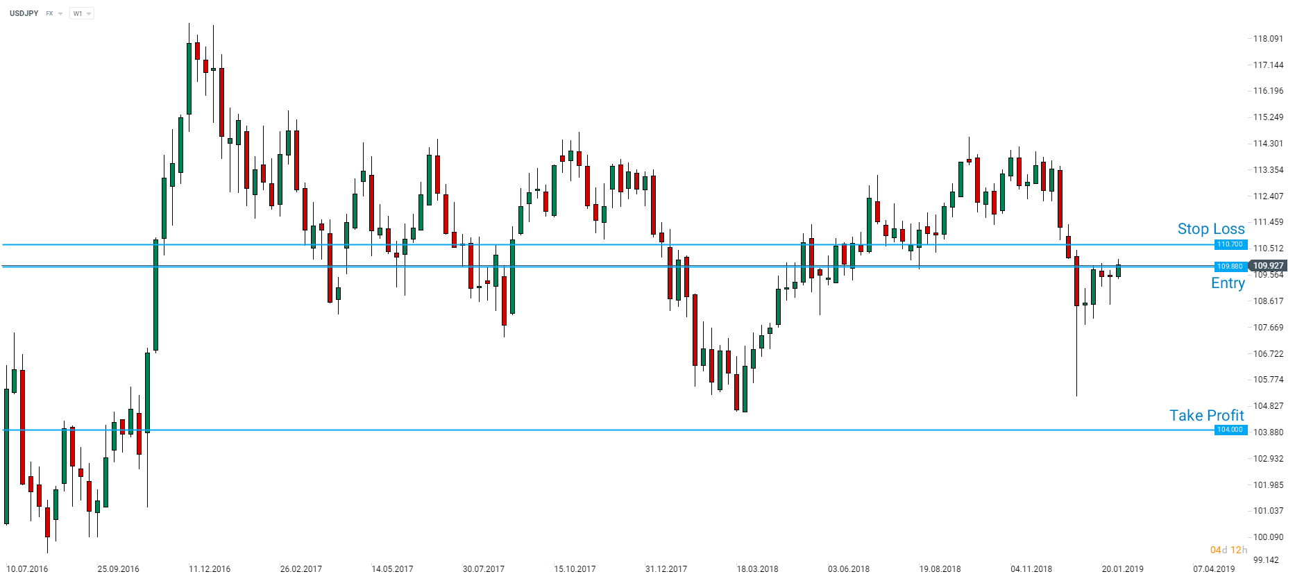 Morgan Stanley sugerează plasarea unei poziții short pe USDJPY la prețul pieței cu ținta la 104.00 și stop loss order la 110.70. Sursa: xStation5