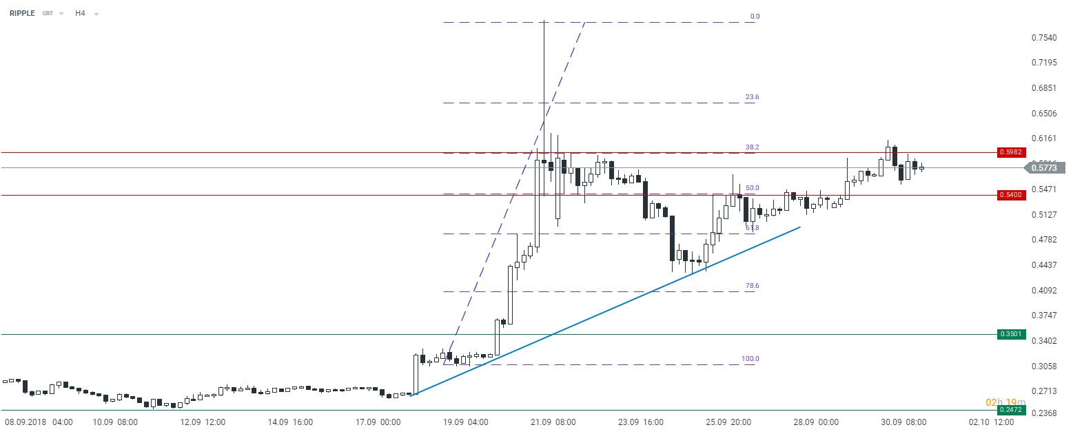 Ripple a conturat o formațiune bearish engulfing în momentul în care a încercat să spargă nivelul de 0,60 dolari și, ca urmare, ne putem aștepta ca prețul să oscileze în continuare. În cazul în care cumpărătorii vor împinge în continuare prețul în sus, acest nivel ar trebui spart. Sursa: xStation5