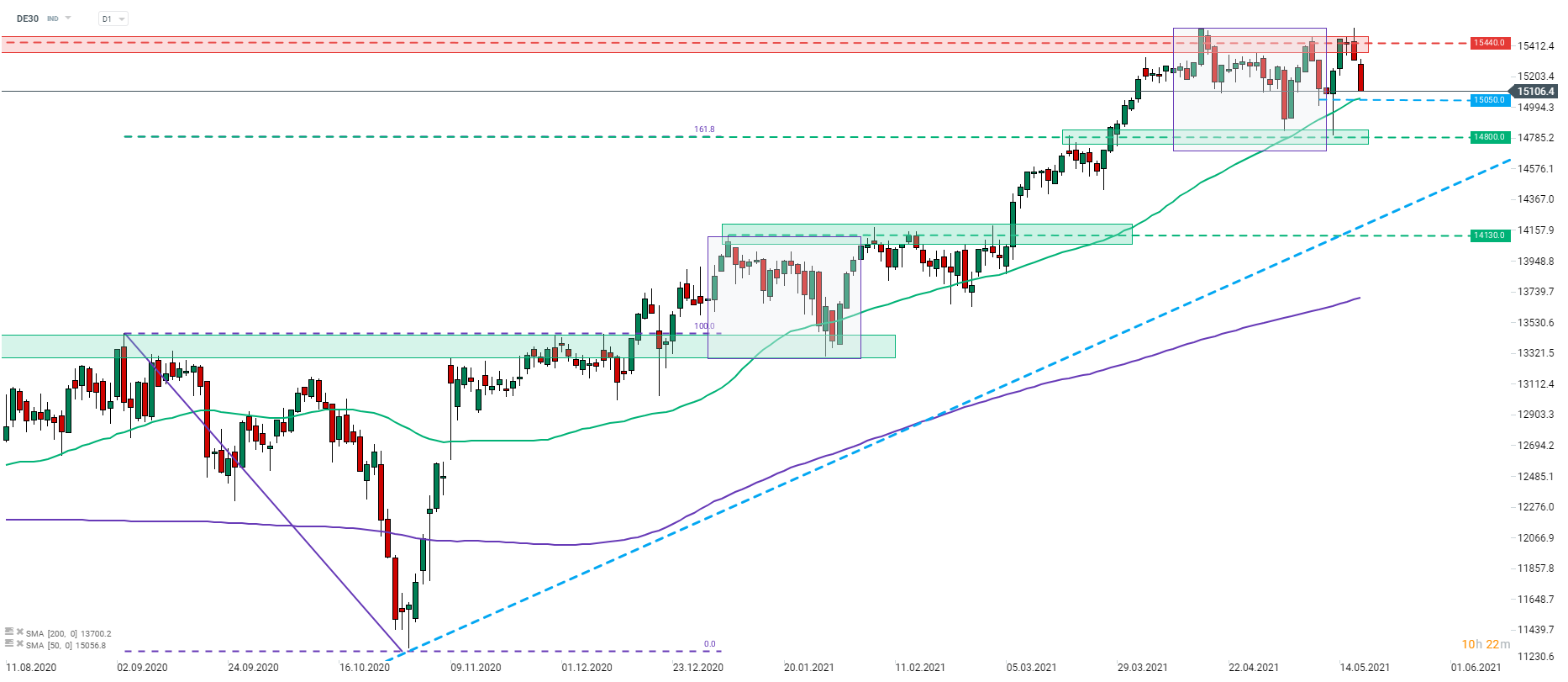DE30 a reușit să atingă ieri un maxim intraday, dar stările de spirit s-au deteriorat ulterior. Indicele scade în jur de 1,5% astăzi și se apropie de nivelurile minime locale recente și de media mobilă de 50 de sesiuni din zona de 15.050 puncte. Sursa: xStation5