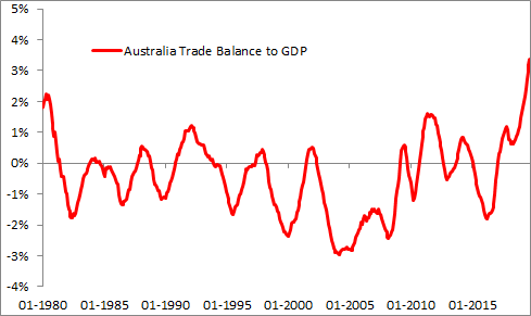 Excedentul comercial australian continuă să se mărească. Sursa: Macrobond, XTB