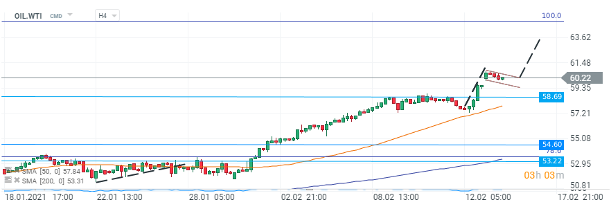 Piața futures pentru cotația WTI a avansat cu până la 2,5%, depășind pragul de 60 de dolari pe baril pentru prima dată din ianuarie 2020, în timp ce prețul Brent a depășit zona de 63 de dolari. Producția de petrol din Bazinul Permian a scăzut cu până la 1 milion de barili pe zi, pe măsură ce temperaturile s-au redus până la minus 1 grad Fahrenheit (minus 18 Celsius) în Midland, Texas, care este considerată capitala producției de șist din SUA conform.