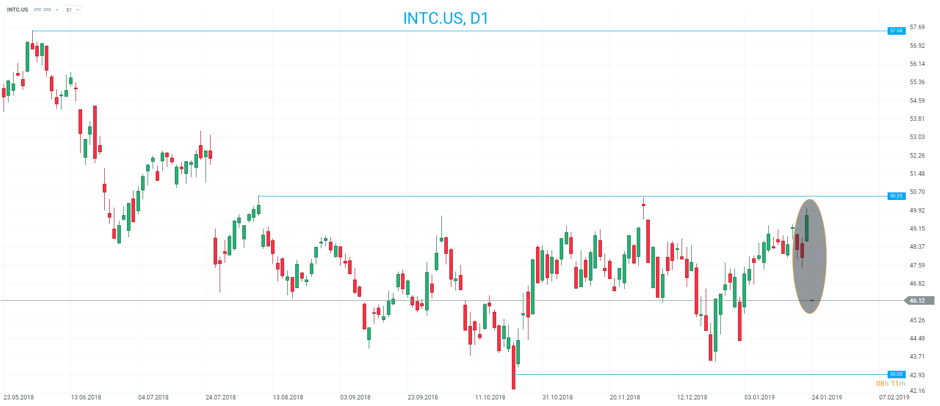 Acțiunile Intel au început sesiunea de tranzacționare în scădere din cauza ultimei raportări a veniturilor. Piața a eșuat din nou în a sparge zona de rezistență de 50.50. Sursa: xStation