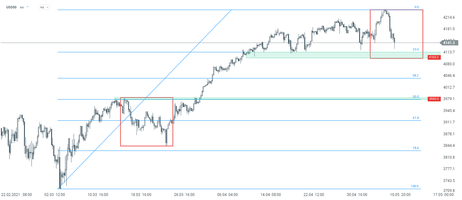 Analizând indicele S&P 500 (US500) din punct de vedere tehnic, se observă o potențială continuare a mișcării ca parte a unei corecții descendente. Dacă corecția se accentuează, este posibil un atac asupra suportului de la aproximativ 4.100 de puncte. Acest nivel este marcat cu limita inferioară a structurii 1: 1. Conform metodologiei Overbalance, doar o spargere în jos ar duce la o schimbare a tendinței.