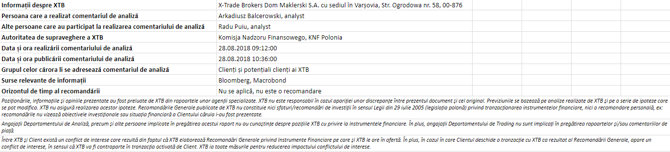 "Acest material este o comunicare de marketing în sensul articolului 24 alineatul (3) din Directiva 2014/65 / UE a Parlamentului European și a Consiliului din 15 mai 2014 privind piețele de instrumente financiare, și de modificare a Directivei 2002/92 / CE și a Directivei 2011 / 61 / UE (MiFID II). Comunicarea de marketing nu este o recomandare de investiții sau o recomandare de informații sau o recomandare care sugerează o strategie de investiții în sensul Regulamentului (UE) nr. 596/2014 al Parlamentului European și al Consiliului din 16 aprilie 2014 privind abuzul de piață ( reglementarea abuzului de piață) și de abrogare a Directivei 2003/6 / CE a Parlamentului European și a Consiliului și a Directivelor Comisiei 2003/124 / CE, 2003/125 / CE și 2004/72 / CE și a Regulamentului delegat (UE) 2016/958 al Comisiei din 9 596/2014 al Parlamentului European și al Consiliului în ceea ce privește standardele tehnice de reglementare pentru aranjamentele tehnice pentru prezentarea obiectivă a recomandărilor de investiții sau a altor informații care sugerează strategii de investiții și pentru dezvăluirea de interese particulare sau indicații de conflicte de interese sau orice alte sfaturi, inclusiv în domeniul consultanței în materie de investiții, în sensul Legii privind tranzacționarea cu instrumente financiare din 29 iulie 2005 (de ex. Journal of Laws 2019, articolul 875, astfel cum a fost modificat). Comunicarea de marketing este pregătită cu cea mai mare diligență, obiectivitate, prezintă faptele cunoscute autorului la data pregătirii și este lipsită de orice elemente de evaluare. Comunicarea de marketing este pregătită fără a lua în considerare nevoile clientului, situația sa financiară individuală și nu prezintă nicio strategie de investiții în niciun fel. Comunicarea de marketing nu constituie o ofertă de vânzare, oferire, abonament, invitație la cumpărare, reclamă sau promovare a oricărui instrument financiar. XTB SA nu este responsabilă pentru acțiunile sau omisiunile niciunui client, în special pentru achiziționarea sau cedarea instrumente, întreprinse pe baza informațiilor conținute în această comunicare de marketing. XTB SA nu va accepta răspunderea pentru nicio pierdere sau daună, inclusiv, fără limitare, orice pierdere care poate apărea direct sau indirect, efectuată pe baza informațiilor conținute în această comunicare de marketing. În cazul în care comunicarea de marketing conține informații despre orice rezultat cu privire la instrumentele financiare indicate în acestea, acestea nu constituie nicio garanție sau prognoză cu privire la rezultatele viitoare. Performanțele anterioare nu indică neapărat rezultatele viitoare și orice persoană care acționează pe baza acestor informații o face pe propriul risc. Acest material nu este emis pentru a influenta deciziile de tranzacționare ale niciunei persoane. Informațiile cuprinse în cadrul acestui material nu sunt prezentate pentru a fi aplicate, copiate sau testate în cadrul tranzacțiilor dumneavoastră. Informațiile cuprinse în cadrul acestui material sunt emise în baza experienței proprii a emitentului și nu reprezintă o recomandare individuală, nu vizează atingerea anumitor obiective, randamente financiare și nu se adresează nevoilor niciunei persoane anume care ar primi-o. Premisele acestui material nu au în vedere situația și persoana dumneavoastră deci nu recomandăm utilizarea acestor informații sub orice formă. Utilizarea informațiilor cuprinse în cadrul acestui material în orice modalitate se face pe propria dumneavoastră răspundere. Acest material este emis de către un analist pentru care își asumă răspunderea XTB SA, persoană juridică autorizată de KNF – Autoritatea de Supraveghere Financiara din Polonia."