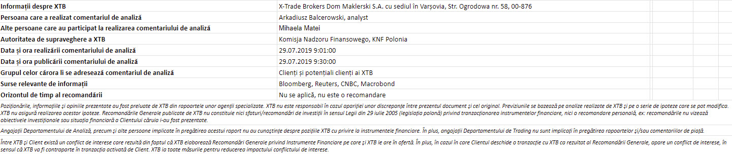 Fostul președinte Fed, Janet Yellen, a aprobat în mod deschis necesitatea unei reduceri de rată în luna iulie, pe fondul decelerării creșterii economice globale și a creșterii prețurilor scăzute. Pe de altă parte, ea nu percepe aceste reduceri ca fiind începutul unui ciclu de relaxare, cu excepția cazului în care lucrurile se înrăutățesc. Mai mult, Yellen a subliniat că economia Statelor Unite este caracterizată de o piață a muncii puternică, însă inflația este încă prea scăzută, justificând scenariul unei scăderi a ratei de prevenire. Așteptările pieței indică o reducere a ratei de 25 bps și o cotă de 10% pentru o reducere de 50 bps - acest scenariu pare să reprezinte o glumă primită vineri, moment în care au fost publicate datele preliminare privind PIB-ul. Între timp, se așteaptă ca oficialii chinezi și americani să organizeze discuții de două zile la Beijing începând de marți, fără a-și manifesta voința de a face compromisuri. Aceasta va fi prima întâlnire față în față după summitul G20 de la Osaka, Japonia, ce a avut loc luna trecută.