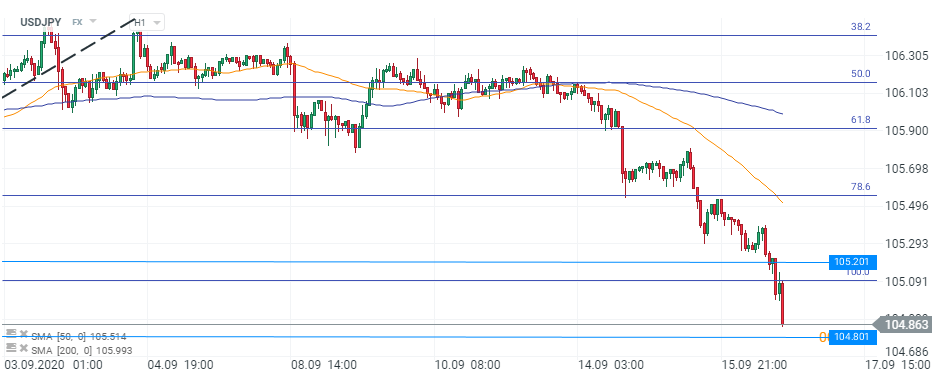 În acest context, am asistat la un avans puternic din partea yenului, care, la momentul publicării, înregistra o apreciere de aproximativ 0,60% de la începutul sesiunii. Mai mult, perechea a reușit să depășească o zonă de suport importantă (105,200 - 105,100), marcată de minimele atinse la sfârșitul lunii august și punctul de încheiere al secvenței corective de la sfârșitul lunii iulie, prin urmare reprezenta o rezistență destul de solidă pentru investitori. În continuare, următorul nivel de rezistență este marcat de reacții anterioare ale prețului din iulie. Slăbiciunea dolarului ar putea persista până la anunțarea deciziei Fed din această seară, investitorii continuând să includă în preț o atitudine dovish din partea Fed și posibilitatea de extindere a stimulentelor monetare. Totuși, în cazul unei abordări mai hawkish potențialul de redresare al dolarului este solid.