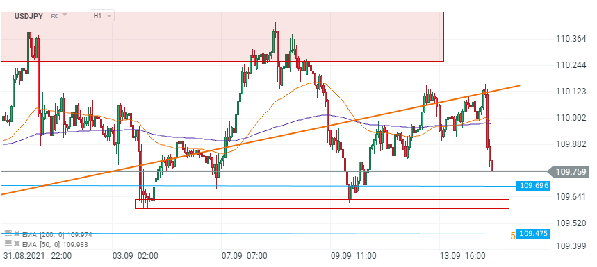 În acest context, USDJPY a scăzut. Mișcarea descendentă a izbucnit după ce cotația a testat linia ascendentă de trend, care, în trecut, a acționat drept latură inferioară a formațiunii de triunghi. De acolo, vânzătorii au profitat de impulsul oferit de datele din SUA și au alimentat secvența de scădere. Spargerea zonei de la 110 a fost un alt punct cheie, acesta fiind un prag psihologic care era susținut și de cele două medii mobile, de 50 și 200 de perioade (liniile portocalii și mov).