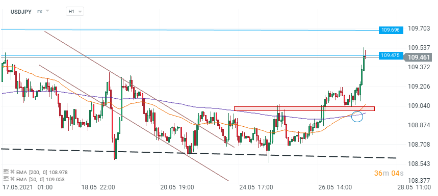 USDJPY a dezvoltat o mișcare ascendentă puternică după ce a reușit să spargă rezistența importantă din jurul pragului 109 (zona roșie). Această ”victorie” a deschis drumul cotației către rezistența de la 109,475 care pare a fi următorul obstacol în calea cumpărătorilor. În cazul unei desprinderi ascendente, prețul s-ar putea îndrepta către zona 109,696 care este marcată de reacții de preț recente. Un alt aspect pozitiv pentru tauri îl reprezintă apariția pe grafic a unui scenariu ”Golden Cross” (cercul albastru), unde media mobilă de 50 de perioade a depășit media mobilă de 200 de perioade, ceea ce, de obicei, semnalizează o continuare bullish întrucât intensitatea mișcării actuale este solidă.