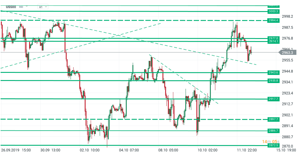 Ziua liberă din SUA nu a fost una de sărbătoare și pentru investitori: cotațiile US500 au coborât, cu toate că Mnuchin a încercat să potolească temerile că, de fapt, China nu ar fi chiar hotărâtă să ajungă la un acord ”faza 1”. În fapt, corecția este o așezare naturală după un optimism punctat cu elemente speculative pe final de săptămână. Discuțiile continuă, dar traderii își amintesc de situația din primăvară când o înțelegere ce părea ca și asigurată a fost deturnată cu puțin înaintea anunțului final, din motive care nu țin de aspecte comerciale, precum respectarea proprietății intelectuale și modificări legislative solicitate de SUA Chinei. Linia de trend descendent spartă vineri a operat ca suport, iar sesiunea restrânsă de azi (ziua lui Columb) nu pare a aduce o amenințare pe termen scurt.